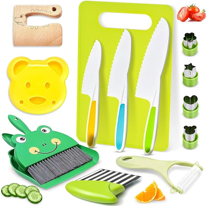 - Umfangreiches Set: Enthält 3 kindersichere Messer, Kartoffelschneider, Schneidebrett, 4 Ausstechformen, Sandwichmaker, Mini-Besen, Kehrschaufel, Schäler und ein Holzmesser.